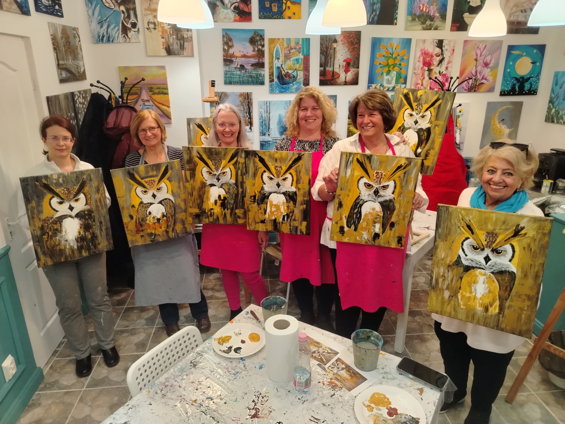 Az arany háttér gyönyörűen kiemelte a baglyok tekintetét, a textúrák pedig igazán különlegessé tették az alkotásokat. A hangulat pedig? Felszabadult, barátnős, igazi énidős este volt. ✨